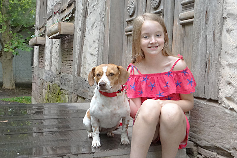 menina com cãozinho na escada